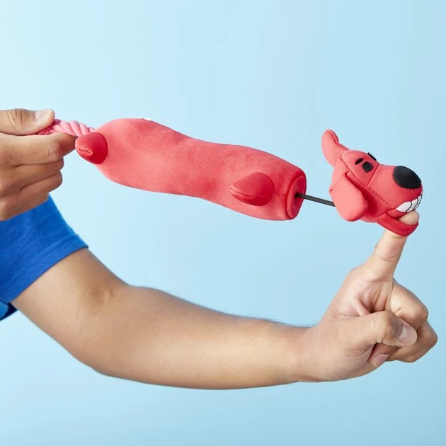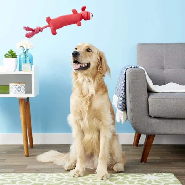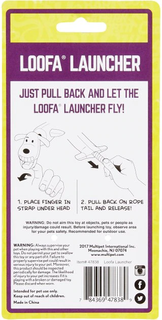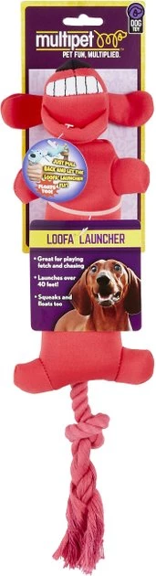 Multipet’s Loofa Launcher is great for flinging and swinging across the yard for play. The rope tail on the bottom sling shots when pulled and released making it an instant favorite.