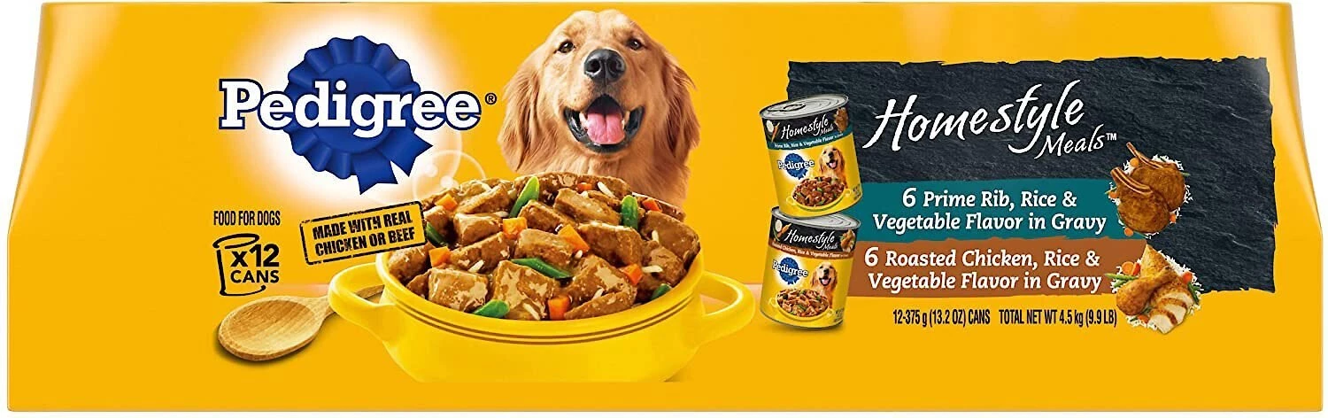 Your dog deserves the best—that’s why Pedigree Adult Complete Nutrition Chicken Flavor Dry Dog Food + Homestyle Meals Prime Rib, Rice & Vegetable Flavor in Gravy & Roasted Chicken, Rice & Vegetable Flavor in Gravy Canned Soft Wet Food Variety Pack deliver 100 percent complete and balanced nutrition to help him thrive. This tasty dry kibble has the antioxidants, vitamins and minerals canines need to maintain a healthy lifestyle. Omega-6 fatty acids help nourish skin for a shiny coat, while whole grains aid in healthy digestion. Meanwhile, the hearty, moist food features real beef plus hearty veggies to help keep your best friend looking and feeling his best. With this variety pack of meaty flavors, you can mix up mealtime and keep it exciting for tail-wagging good taste.