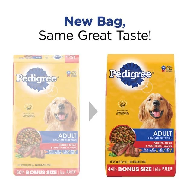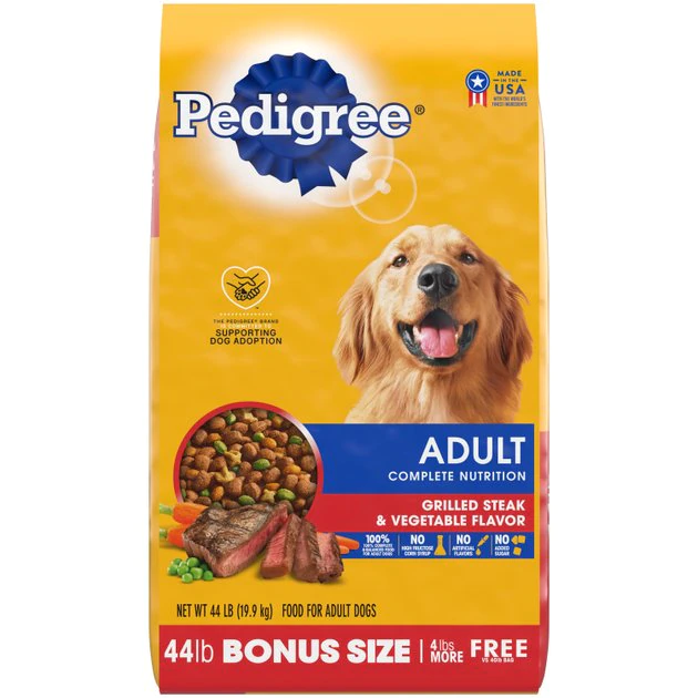 Give your furry friend a taste of the good life with the Pedigree Adult Complete Nutrition Grilled Steak & Vegetable Flavor Dry Dog Food. With a succulent steak flavor accented with hearty vegetables, this food has everything you need to keep your dog feeling his best. It’s prepared with whole grains for healthy digestion, plus essential nutrients and omega-6 fatty acids to promote a healthy skin and luxurious coat. And perhaps best of all, the crunchy texture of the kibble helps clean his teeth, so he’s always ready for his close up. It’s the easy way to combine great-tasting food plus nutrition that promotes health and vitality into a single bowl.