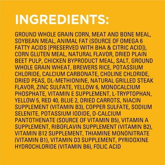Ground Whole Grain Corn, Meat And Bone Meal, Corn Gluten Meal, Animal Fat (Source Of Omega 6 Fatty Acids [Preserved With Bha & Citric Acid]), Soybean Meal, Natural Flavor, Chicken By-Product Meal, Dried Plain Beet Pulp, Salt, Potassium Chloride, Brewers Rice, Ground Whole Grain Wheat, Choline Chloride, Calcium Carbonate, Dried Peas, Dl-Methionine, Natural Grilled Steak Flavor, Zinc Sulfate, Vitamin E Supplement, Monocalcium Phosphate, L-Tryptophan, Red 40, Yellow 6, Dried Carrots, Niacin [Vitamin B3], Blue 2, Yellow 5, D-Calcium Pantothenate [Source Of Vitamin B5], Copper Sulfate, Sodium Selenite, Potassium Iodide, Vitamin A Supplement, Riboflavin Supplement [Vitamin B2], Vitamin B12 Supplement, Thiamine Mononitrate [Vitamin B1], Vitamin D3 Supplement, Pyridoxine Hydrochloride [Vitamin B6], Folic Acid.