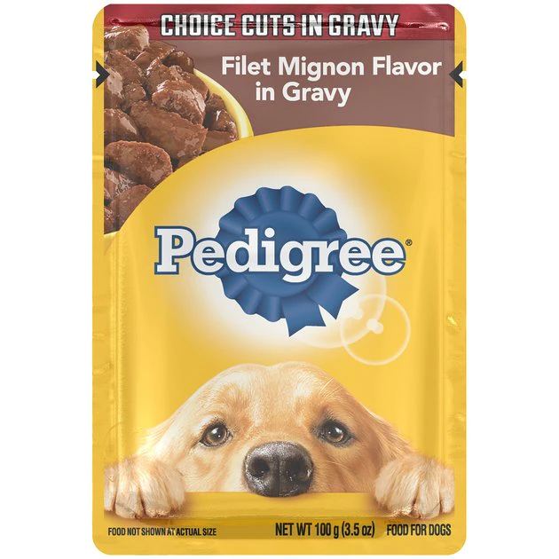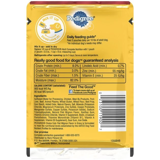 Give your dog the food he deserves with the Pedigree Choice Cuts Filet Mignon Flavor in Gravy Wet Dog Food. It’s made with real meat soaked in a savory gravy, plus optimal levels of oils and minerals to promote healthy skin and a shiny coat. Perfect on its own or as a complete meal, you can also mix it with kibble for extra flavor, or even give him a pinch as a tasty reward. And no matter which way you serve this meaty feast, you’ll be sure to get a tail wag every time—plus it comes in a fast and convenient single-serve pouch that means no messy leftovers.