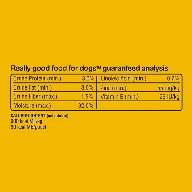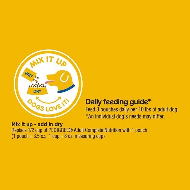 Feed 3 pouches daily per 10 lbs of Adult dog. An individual dog’s needs may differ.