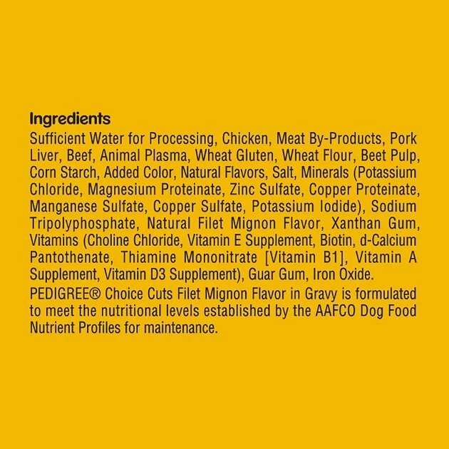 Sufficient Water For Processing, Chicken, Meat By-Products, Pork Liver, Beef, Animal Plasma, Wheat Gluten, Wheat Flour, Beet Pulp, Corn Starch, Added Color, Natural Flavors, Salt, Minerals (Potassium Chloride, Magnesium Proteinate, Zinc Sulfate, Copper Proteinate, Manganese Sulfate, Copper Sulfate, Potassium Iodide), Sodium Tripolyphosphate, Natural Filet Mignon Flavor, Xanthan Gum, Vitamins (Choline Chloride, Vitamin E Supplement, Biotin, D-Calcium Pantothenate, Thiamine Mononitrate [Vitamin B1], Vitamin A Supplement, Vitamin D3 Supplement), Guar Gum, Iron Oxide.