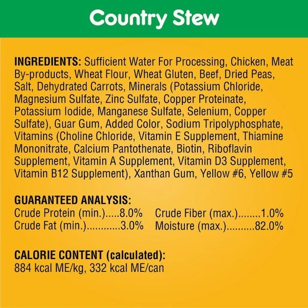 INGREDIENTS: Sufficient Water for Processing, Chicken, Meat By-Products, Wheat Flour, Wheat Gluten, Pork Liver, Beef, Dried Peas, Dehydrated Carrots, Guar Gum, Minerals (Potassium Chloride, Magnesium Proteinate, Zinc Sulfate, Potassium Iodine, Copper Proteinate, Manganese Sulfate, Copper Sulfate), Added Color, Natural Flavor, Glycine, Xanthan Gum, Vitamins (Choline Chloride, Vitamin E Supplement, Biotin, Calcium Pantothenate, Thiamine Mononitrate, Vitamin A Supplement, Vitamin D3 Supplement), Yellow #6, Yellow #5
