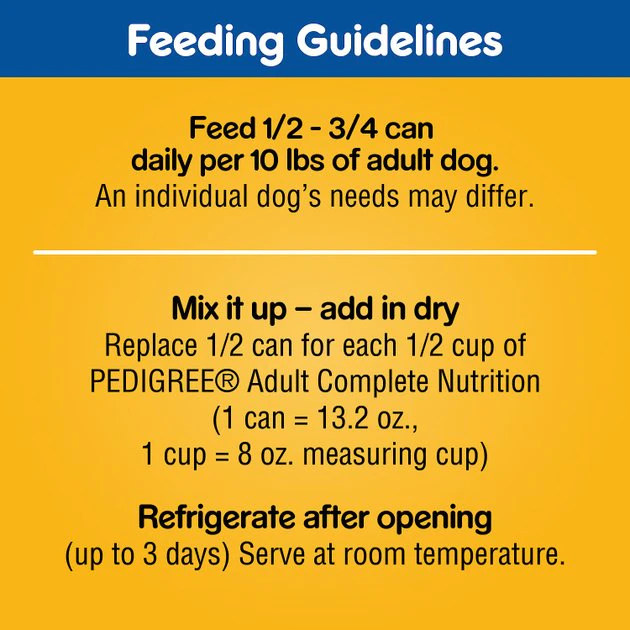 *An individual dog’s needs may differ. Mix it up – add in dry. Replace 1/2 can for each 1/2 cup of dry PEDIGREE Adult Complete Nutrition (1 can = 13.2 oz., 1 cup = 8 oz. measuring cup) refrigerate after opening