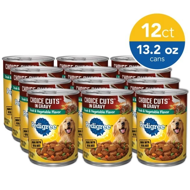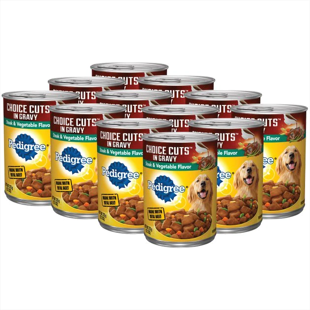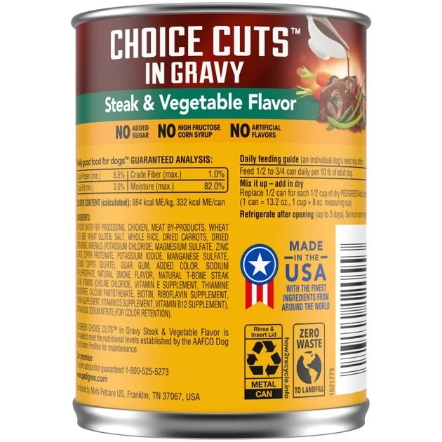 Help your dog grow happy and healthy with the Pedigree Choice Cuts in Gravy Steak & Vegetable Flavor Canned Dog Food. Made with flavorful morsels in a delectable gravy, this meaty feast contains optimal levels of oils and minerals to promote healthy skin and a glistening coat. The balanced recipe is also highly digestible, which means your dog can easily absorb all those essential nutrients—so you can feel confident that he’s getting the most out of every meal. But all he’ll really care about is the irresistible flavor, which is sure to get a tail wag at every mealtime.