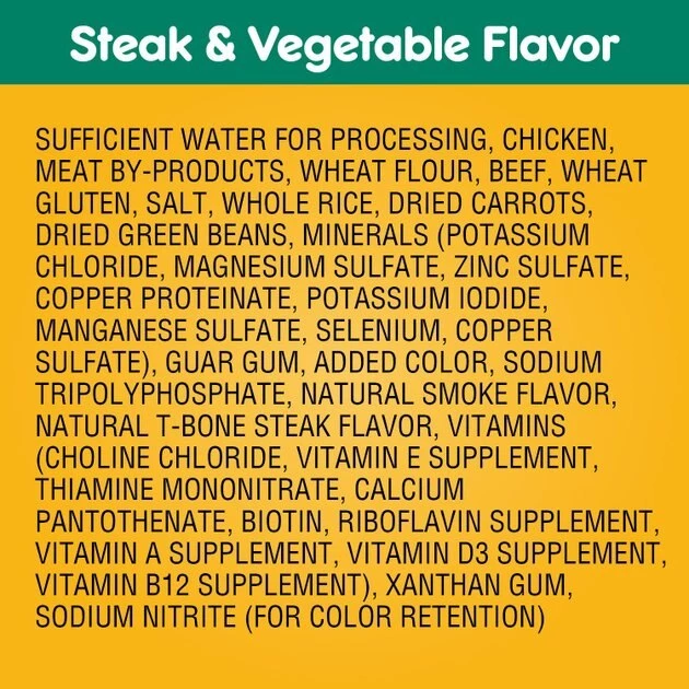 Sufficient Water For Processing, Chicken, Meat By-Products, Wheat Flour, Beef, Wheat Gluten, Salt, Whole Rice, Dried Carrots, Dried Green Beans, Minerals (Potassium Chloride, Magnesium Sulfate, Zinc Sulfate, Copper Proteinate, Potassium Iodide, Manganese Sulfate, Selenium, Copper Sulfate), Guar Gum, Added Color, Sodium Tripolyphosphate, Natural Smoke Flavor, Natural T-Bone Steak Flavor, Vitamins (Choline Chloride, Vitamin E Supplement, Thiamine Mononitrate, Calcium Pantothenate, Biotin, Riboflavin Supplement, Vitamin A Supplement, Vitamin D3 Supplement, Vitamin B12 Supplement), Xanthan Gum, Sodium Nitrite (For Color Retention).