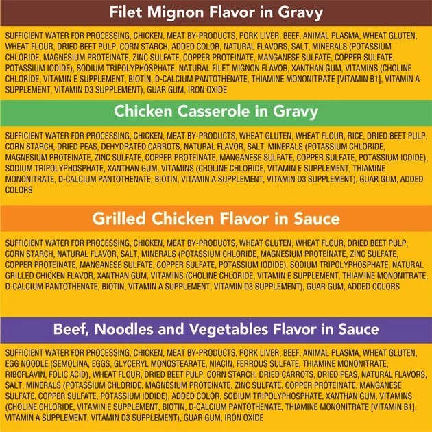 Filet Mignon Flavor in Gravy: Sufficient Water for Processing, Chicken, Meat By-Products, Pork Liver, Beef, Animal Plasma, Wheat Gluten, Wheat Flour, Dried Beet Pulp, Corn Starch, Added Color, Natural Flavors, Salt, Minerals (Potassium Chloride, Magnesium Proteinate, Zinc Sulfate, Copper Proteinate, Manganese Sulfate, Copper Sulfate, Potassium Iodide), Sodium Tripolyphosphate, Natural Filet Mignon Flavor, Xanthan Gum, Vitamins (Choline Chloride, Vitamin E Supplement, Biotin, d-Calcium Pantothenate, Thiamine Mononitrate [Vitamin B1], Vitamin A Supplement, Vitamin D3 Supplement), Guar Gum, Iron Oxide.