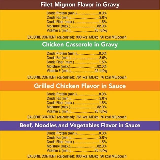 Beef, Noodles and Vegetables Flavor in Sauce: Sufficient Water for Processing, Chicken, Meat By-Products, Pork Liver, Beef, Animal Plasma, Wheat Gluten, Egg Noodle (Semolina, Eggs, Glyceryl Monostearate, Niacin, Ferrous Sulfate, Thiamine Mononitrate, Riboflavin, Folic Acid), Wheat Flour, Dried Beet Pulp, Corn Starch, Dried Carrots, Dried Peas, Natural Flavors, Salt, Minerals (Potassium Chloride, Magnesium Proteinate, Zinc Sulfate, Copper Proteinate, Manganese Sulfate, Copper Sulfate, Potassium Iodide), Added Color, Sodium Tripolyphosphate, Xanthan Gum, Vitamins (Choline Chloride, Vitamin E Supplement, Biotin, d-Calcium Pantothenate, Thiamine Mononitrate [Vitamin B1], Vitamin A Supplement, Vitamin D3 Supplement), Guar Gum, Iron Oxide.