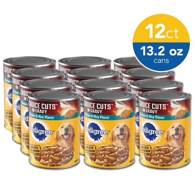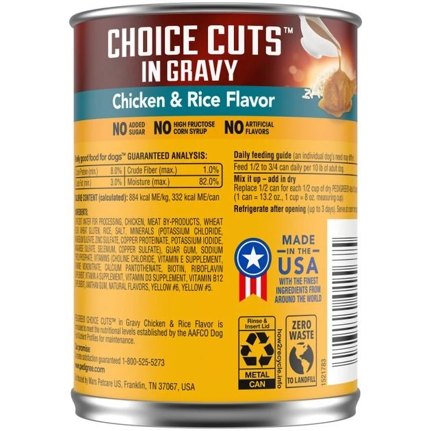 Help your dog grow happy and healthy with the Pedigree Choice Cuts in Gravy With Chicken & Rice Canned Dog Food. Made with flavorful morsels in a delectable gravy, this meaty feast contains optimal levels of oils and minerals to promote healthy skin and a glistening coat. The balanced recipe is also highly digestible, which means your dog can easily absorb all those essential nutrients—so you can feel confident that he’s getting the most out of every meal. But all he’ll really care about is the irresistible flavor, which is sure to get a tail wag at every mealtime.