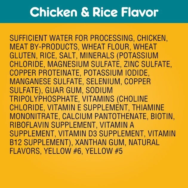 Sufficient Water For Processing, Chicken, Meat By-Products, Wheat Flour, Wheat Gluten, Rice, Salt, Minerals (Potassium Chloride, Magnesium Sulfate, Zinc Sulfate, Copper Proteinate, Potassium Iodide, Manganese Sulfate, Selenium, Copper Sulfate), Guar Gum, Sodium Tripolyphosphate, Vitamins (Choline Chloride, Vitamin E Supplement, Thiamine Mononitrate, Calcium Pantothenate, Biotin, Riboflavin Supplement, Vitamin A Supplement, Vitamin D3 Supplement, Vitamin B12 Supplement), Xanthan Gum, Natural Flavors, Yellow #6, Yellow #5.