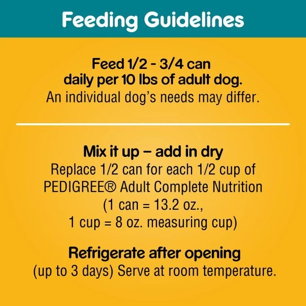 13.2-oz can: Feed 1/2 – 3/4 can daily per 10 lbs of Adult dog. Refrigerate after opening (up to 3 days). Serve at room temperature.