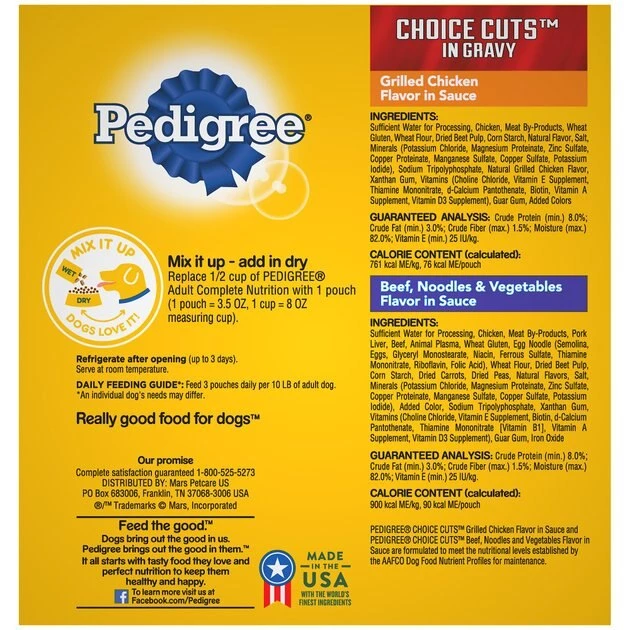 Give your dog the food he deserves with the Pedigree Choice Cuts Variety Pack Beef & Chicken Wet Dog Food. It’s made with real meat soaked in a savory gravy, plus optimal levels of oils and minerals to promote healthy skin and a shiny coat. Perfect on its own or as a complete meal, you can also mix it with kibble for extra flavor, or even give him a pinch as a tasty reward. And no matter which way you serve this meaty feast, you’ll be sure to get a tail wag every time—plus it comes in a fast and convenient single-serve pouch that means no messy leftovers. He’ll love the variety of flavor choices!