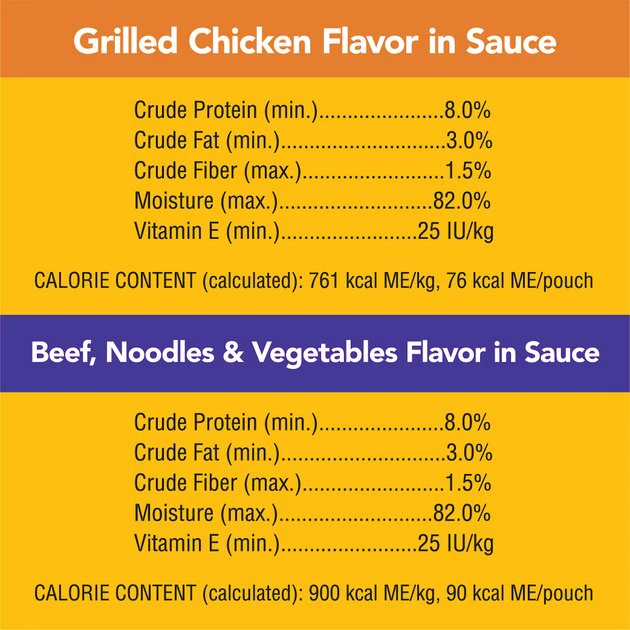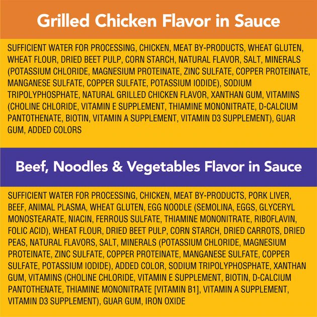 Beef, Noodles and Vegetables Flavor in Sauce: Sufficient Water for Processing, Chicken, Meat By-Products, Pork Liver, Beef, Animal Plasma, Wheat Gluten, Egg Noodle (Semolina, Eggs, Glyceryl Monostearate, Niacin, Ferrous Sulfate, Thiamine Mononitrate, Riboflavin, Folic Acid), Wheat Flour, Dried Beet Pulp, Corn Starch, Dried Carrots, Dried Peas, Natural Flavors, Salt, Minerals (Potassium Chloride, Magnesium Proteinate, Zinc Sulfate, Copper Proteinate, Manganese Sulfate, Copper Sulfate, Potassium Iodide), Added Color, Sodium Tripolyphosphate, Xanthan Gum, Vitamins (Choline Chloride, Vitamin E Supplement, Biotin, d-Calcium Pantothenate, Thiamine Mononitrate [Vitamin B1], Vitamin A Supplement, Vitamin D3 Supplement), Guar Gum, Iron Oxide.