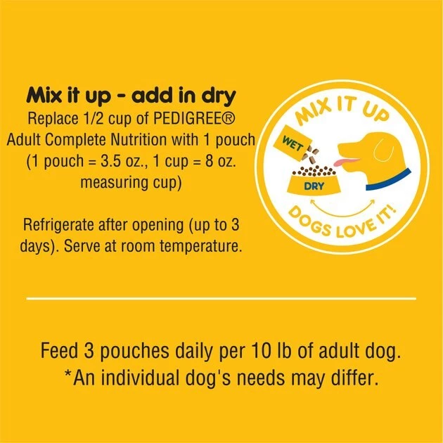 Feed 3 pouches daily per 10 lbs of Adult dog. An individual dog’s needs may differ.