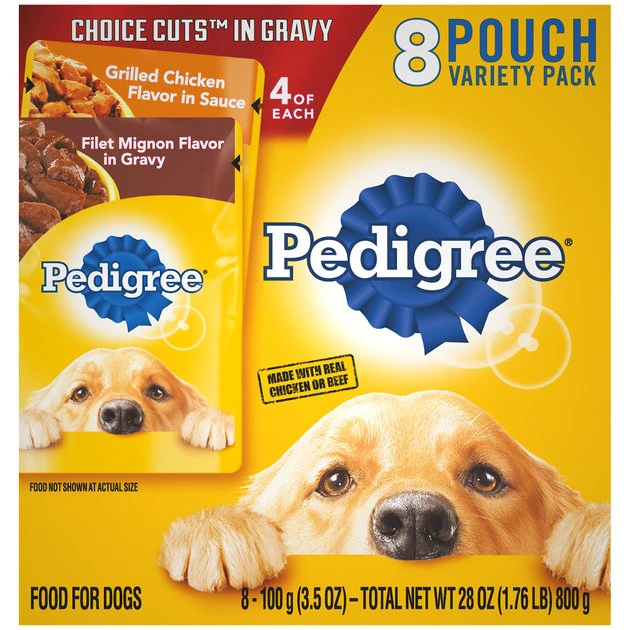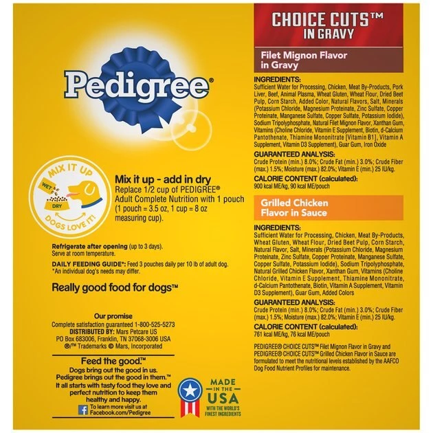 Give your dog the food he deserves with the Pedigree Choice Cuts Variety Pack Grilled Chicken & Filet Mignon Flavor Wet Dog Food. It’s made with real meat soaked in a savory gravy, plus optimal levels of oils and minerals to promote healthy skin and a shiny coat. Perfect on its own or as a complete meal, you can also mix it with kibble for extra flavor, or even give him a pinch as a tasty reward. And no matter which way you serve this meaty feast, you’ll be sure to get a tail wag every time—plus it comes in a fast and convenient single-serve pouch that means no messy leftovers. He’ll love the variety of flavor choices!