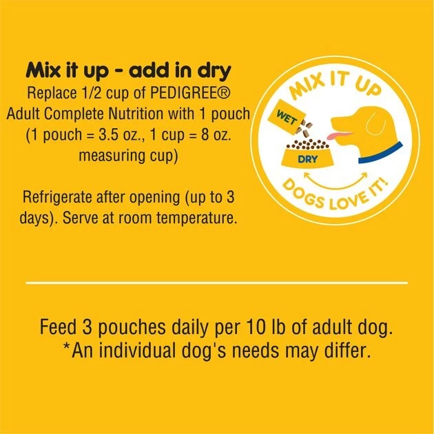 Feed 3 pouches daily per 10 lbs of Adult dog. An individual dog’s needs may differ.