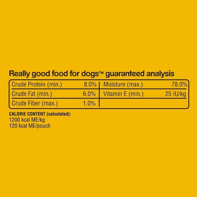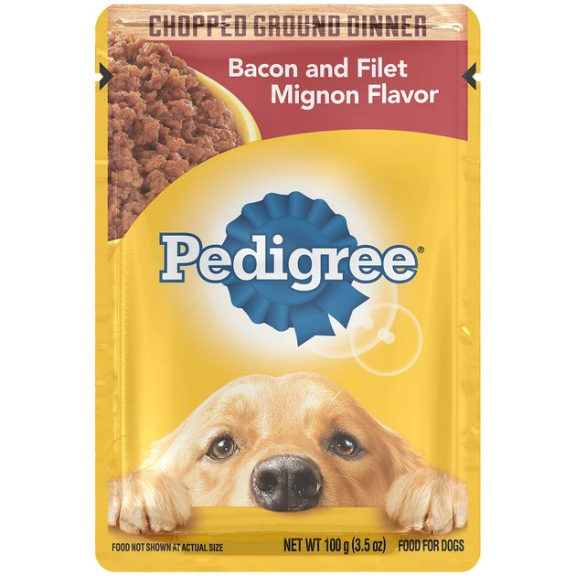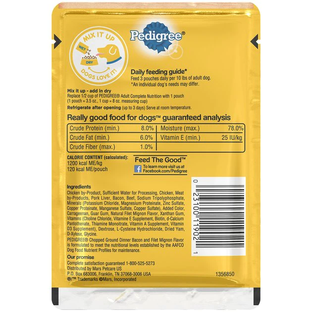 Give your dog the food he deserves with the Pedigree Chopped Ground Dinner Bacon & Filet Mignon Flavor Wet Dog Food. It’s made with real meat chopped into tasty morsels, plus optimal levels of oils and minerals to promote healthy skin and a shiny coat. Perfect on its own or as a complete meal, you can also mix it with kibble for extra flavor, or even give him a pinch as a tasty reward. And no matter which way you serve this meaty feast, you’ll be sure to get a tail wag every time—plus it comes in a fast and convenient single-serve pouch that means no messy leftovers.