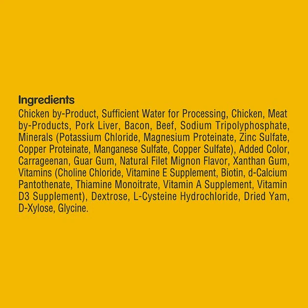 Chicken By-Product, Sufficient Water For Processing, Chicken, Meat By-Products, Pork Liver, Bacon, Beef, Sodium Tripolyphosphate, Minerals (Potassium Chloride, Magnesium Proteinate, Zinc Sulfate, Copper Proteinate, Manganese Sulfate, Copper Sulfate), Added Color, Carrageenan, Guar Gum, Natural Filet Mignon Flavor, Xanthan Gum, Vitamins (Choline Chloride, Vitamine E Supplement, Biotin, D-Calcium Pantothenate, Thiamine Monoitrate, Vitamin A Supplement, Vitamin D3 Supplement), Dextrose, L-Cysteine Hydrochloride, Dried Yam, D-Xylose, Glycine.