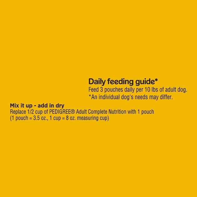 Feed 3 pouches daily per 10 lbs of Adult dog. An individual dog’s needs may differ.