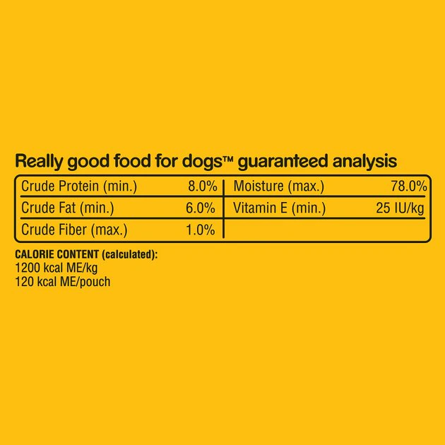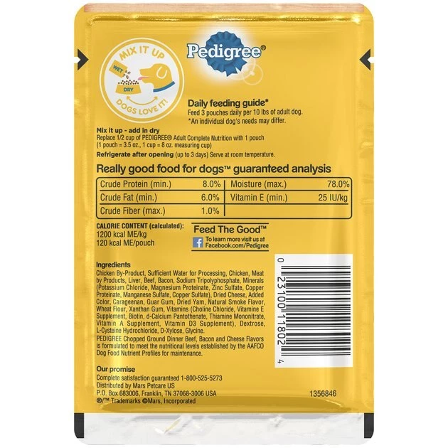 Give your dog the food he deserves with the Pedigree Chopped Ground Dinner Beef, Bacon & Cheese Flavors Wet Dog Food. It’s made with real meat chopped into tasty morsels, plus optimal levels of oils and minerals to promote healthy skin and a shiny coat. Perfect on its own or as a complete meal, you can also mix it with kibble for extra flavor, or even give him a pinch as a tasty reward. And no matter which way you serve this meaty feast, you’ll be sure to get a tail wag every time— plus it comes in a fast and convenient single-serve pouch that means no messy leftovers.
