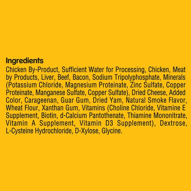 Chicken By-Product, Sufficient Water For Processing, Chicken, Meat By Products, Liver, Beef, Bacon, Sodium Tripolyphosphate, Minerals (Potassium Chloride, Magnesium Proteinate, Zinc Sulfate, Copper Proteinate, Manganese Sulfate, Copper Sulfate), Dried Cheese, Added Color, Carrageenan, Guar Gum, Dried Yam, Natural Smoke Flavor, Wheat Flour, Xanthan Gum, Vitamins (Choline Chloride, Vitamin E Supplement, Biotin, D-Calcium Pantothenate, Thiamine Mononitrate, Vitamin A, Supplement, Vitamin D3 Supplement), Dextrose, L-Cysteine Hydrochloride, D-Xylose, Glycine.