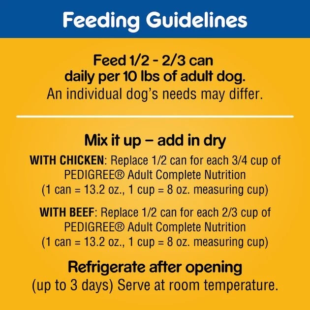 Replace 3/4 can wet for each 1 cup of dry PEDIGREE® Adult Complete Nutrition (1 can = 13.2 oz., 1 cup = 8 oz. measuring cup)