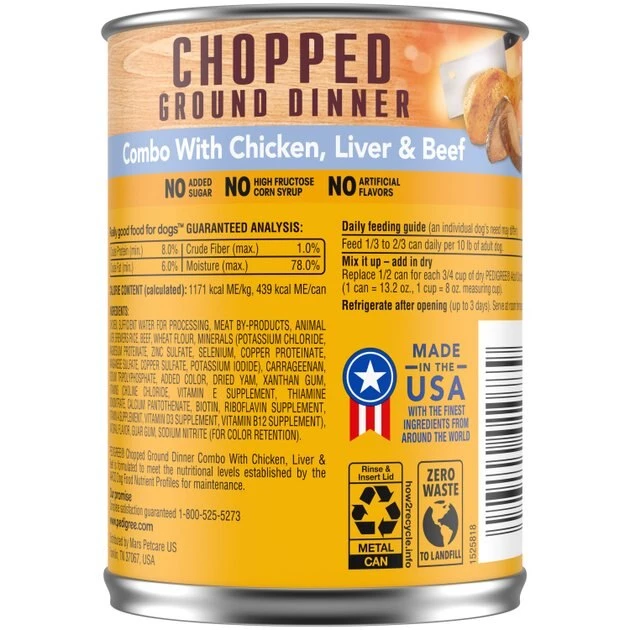 Give your best buddy a hearty meal with the Pedigree Chopped Ground Dinner Combo With Chicken, Beef & Liver Canned Dog Food. Made with a ground texture that will make his mouth water, this meaty feast contains optimal levels of oils and minerals to promote healthy skin and a glistening coat. The balanced recipe is also highly digestible, which means your dog can easily absorb all those essential nutrients—so you can feel confident that he’s getting the most out of every meal. But all he’ll really care about is the irresistible flavor, which is sure to get a tail wag at every mealtime.