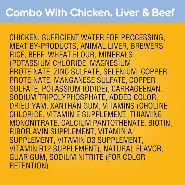 Chicken, Sufficient Water For Processing, Meat By-Products, Animal Liver, Brewers Rice, Beef, Wheat Flour, Minerals (Potassium Chloride, Magnesium Proteinate, Zinc Sulfate, Selenium, Copper Proteinate, Manganese Sulfate, Copper Sulfate, Potassium Iodide), Carrageenan, Sodium Tripolyphosphate, Added Color, Dried Yam, Xanthan Gum, Vitamins (Choline Chloride, Vitamin E Supplement, Thiamine Mononitrate, Calcium Pantothenate, Biotin, Riboflavin Supplement, Vitamin A Supplement, Vitamin D3 Supplement, Vitamin B12 Supplement), Natural Flavor, Guar Gum, Sodium Nitrite (For Color Retention).