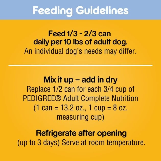 Feed 2/3 can daily per 10 lbs of Adult dog. Refrigerate after opening (up to 3 days). Serve at room temperature.