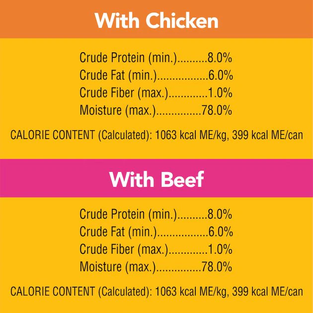 Chicken: Chicken, Sufficient Water For Processing, Meat By-Products, Animal Liver, Brewers Rice, Wheat Flour, Minerals (Potassium Chloride, Magnesium Proteinate, Zinc Sulfate, Selenium, Copper Proteinate, Manganese Sulfate, Copper Sulfate, Potassium Iodide), Carrageenan, Sodium Tripolyphosphate, Dried Yam, Xanthan Gum, Vitamins (Choline Chloride, Vitamin E Supplement, Thiamine Mononitrate, Calcium Pantothenate, Biotin, Riboflavin Supplement, Vitamin A Supplement, Vitamin D3 Supplement, Vitamin B12 Supplement), Natural Flavor, Guar Gum, Yellow #6, Yellow #5.