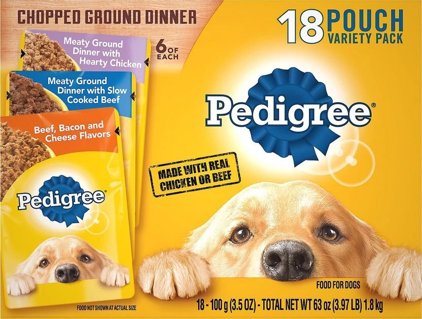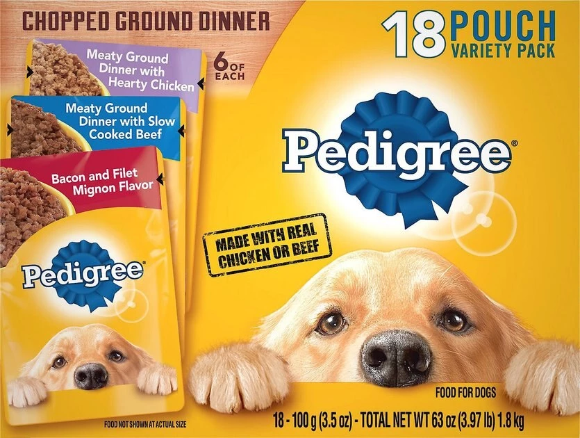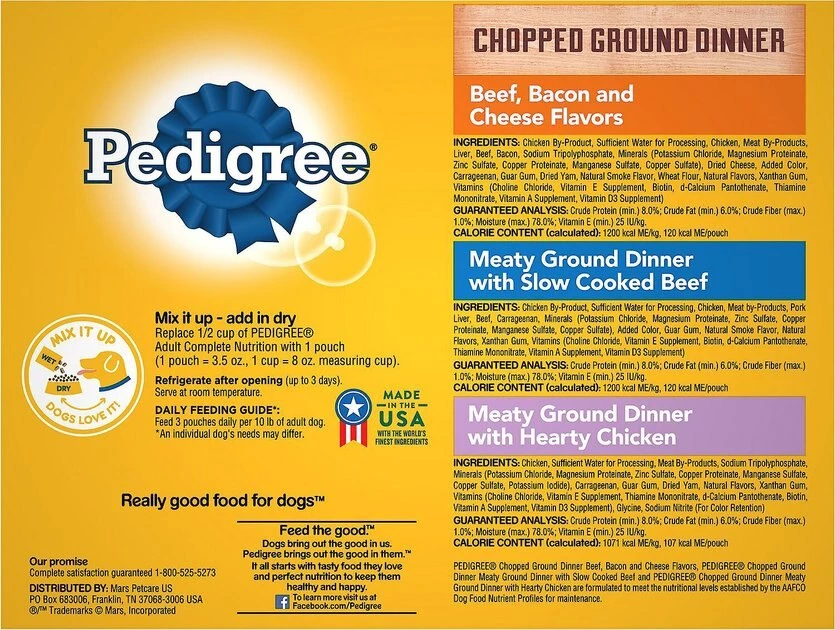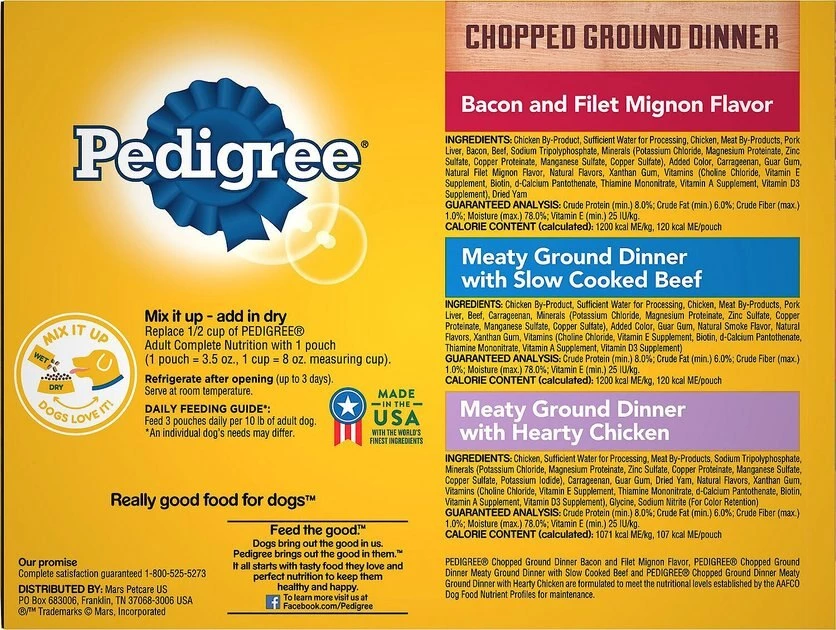 Give your best buddy a hearty choice of meals with Pedigree Chopped Ground Dinner Variety Pack With Chicken, Filet Mignon & Beef + Variety Pack With Chicken, Beef & Bacon Wet Dog Food. Made with a ground texture that will make his mouth water, these meaty feasts contain optimal levels of oils and minerals to promote healthy skin and a glistening coat. Each balanced recipe is also highly digestible, which means your dog can easily absorb all those essential nutrients—so you can feel confident that he’s getting the most out of every meal. But all he’ll really care about are the irresistible flavors, which are sure to get a tail wag at every mealtime.