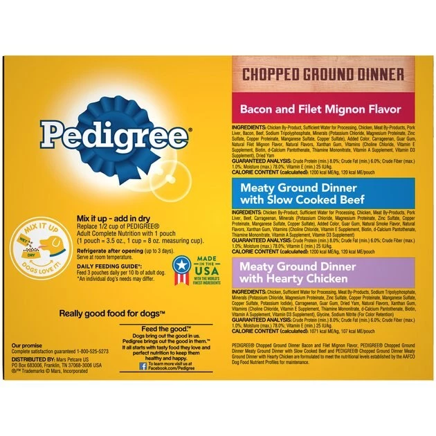 Give your best buddy a hearty choice of meals with the Pedigree Chopped Ground Dinner Variety Pack With Chicken, Filet Mignon & Beef Wet Dog Food. Made with a ground texture that will make his mouth water, this meaty feast contains optimal levels of oils and minerals to promote healthy skin and a glistening coat. The balanced recipe is also highly digestible, which means your dog can easily absorb all those essential nutrients—so you can feel confident that he’s getting the most out of every meal. But all he’ll really care about is the irresistible flavor, which is sure to get a tail wag at every mealtime.