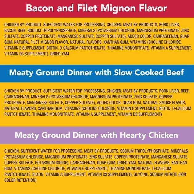 Bacon and Filet Mignon Flavor: Chicken By-Product, Sufficient Water for Processing, Chicken, Meat By-Products, Pork Liver, Bacon, Beef, Sodium Tripolyphosphate, Minerals (Potassium Chloride, Magnesium Proteinate, Zinc Sulfate, Copper Proteinate, Manganese Sulfate, Copper Sulfate), Added Color, Carrageenan, Guar Gum, Natural Filet Mignon Flavor, Natural Flavors, Xanthan Gum, Vitamins (Choline Chloride, Vitamin E Supplement, Biotin, d-Calcium Pantothenate, Thiamine Mononitrate, Vitamin A Supplement, Vitamin D3 Supplement), Dried Yam.