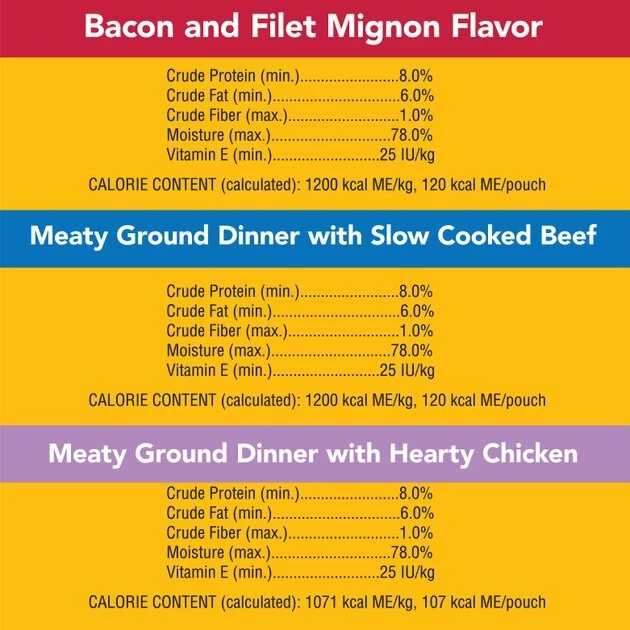 Meaty Ground Dinner with Slow Cooked Beef: Chicken By-Product, Sufficient Water for Processing, Chicken, Meat By-Products, Pork Liver, Beef, Carrageenan, Minerals (Potassium Chloride, Magnesium Proteinate, Zinc Sulfate, Copper Proteinate, Manganese Sulfate, Copper Sulfate), Added Color, Guar Gum, Natural Smoke Flavor, Natural Flavors, Xanthan Gum, Vitamins (Choline Chloride, Vitamin E Supplement, Biotin, d-Calcium Pantothenate, Thiamine Mononitrate, Vitamin A Supplement, Vitamin D3 Supplement).