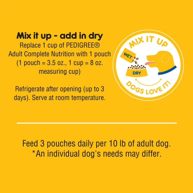 Feed 3 pouches daily per 10 lbs of Adult dog. An individual dog’s needs may differ.