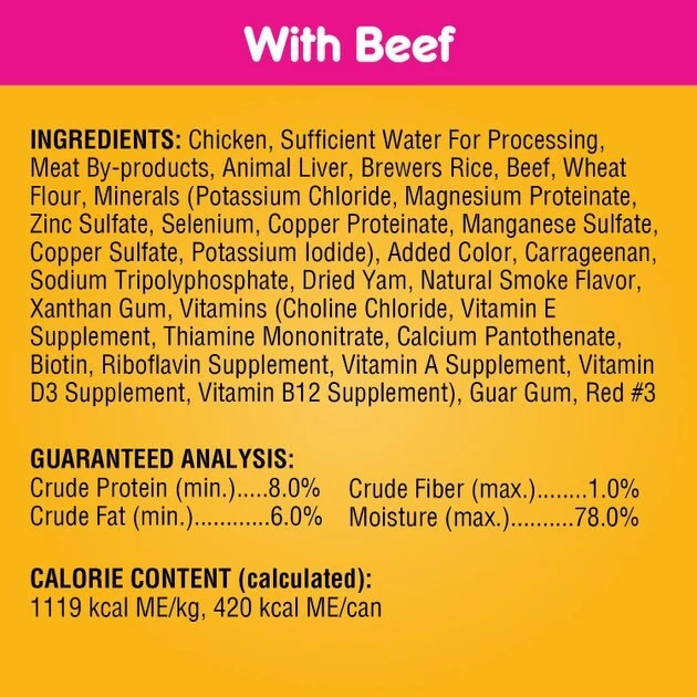 Chicken, Sufficient Water For Processing, Meat By-Products, Animal Liver, Brewers Rice, Beef, Wheat Flour, Minerals (Potassium Chloride, Magnesium Proteinate, Zinc Sulfate, Selenium, Copper Proteinate, Manganese Sulfate, Copper Sulfate, Potassium Iodide), Added Color, Carrageenan, Sodium Tripolyphosphate, Dried Yam, Natural Smoke Flavor, Xanthan Gum, Vitamins (Choline Chloride, Vitamin E Supplement, Thiamine Mononitrate, Calcium Pantothenate, Biotin, Riboflavin Supplement, Vitamin A Supplement, Vitamin D3 Supplement, Vitamin B12 Supplement), Natural Filet Mignon Flavor, Guar Gum, Sodium Nitrite (For Color Retention).