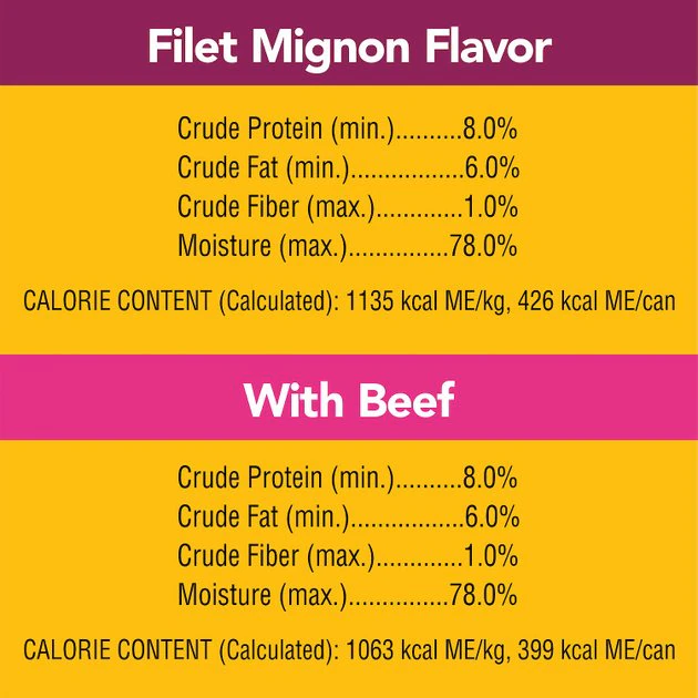 Filet Mignon Flavor: 1119 kcal ME/kg, 420 kcal ME/can