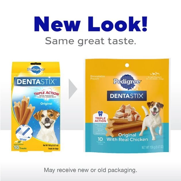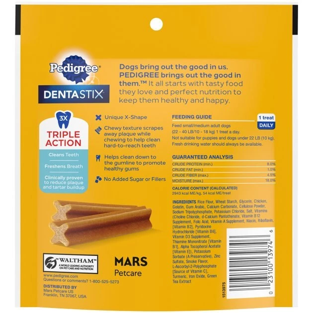 Pedigree Dentastix Original Dog Treats are clinically proven to reduce plaque and tartar buildup—a contributor to gum disease—when used as part of a daily oral care routine. The special texture helps clean down to the gumline. Look for the patented X-shape design. Great for maintaining your dog’s dental health, while rewarding them with a tasty treat!