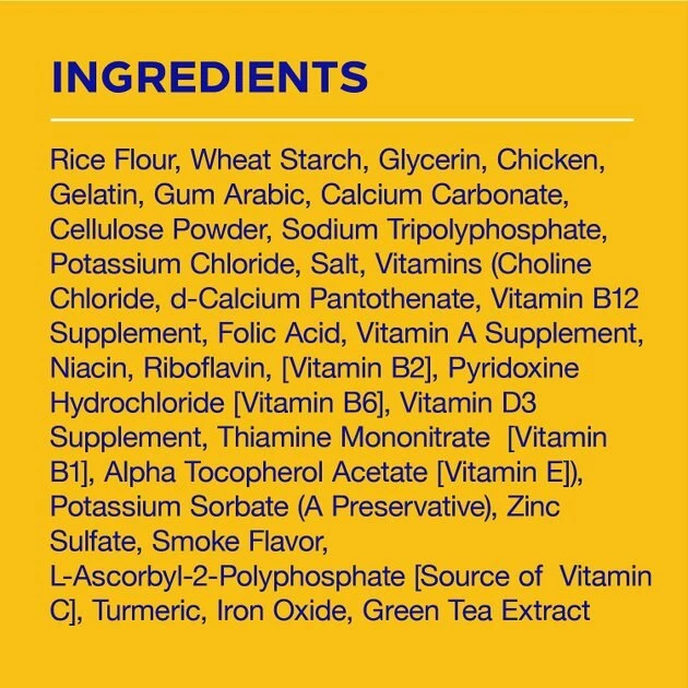 Rice Flour, Wheat Starch, Glycerin, Gelatin, Gum Arabic, Calcium Carbonate, Natural Poultry Flavor, Powdered Cellulose, Sodium Tripolyphosphate, Iodized Salt, Potassium Chloride, Vitamins (Choline Chloride, L-Ascorbyl-2-Polyphosphate [Source of Vitamin C], D-Calcium Pantothenate, Vitamin B12 Supplement, Vitamin A Supplement, Niacin, Riboflavin Supplement [Vitamin B2], Pyridoxine Hydrochloride [Vitamin B6], Vitamin D3 Supplement, Thiamine Mononitrate [Vitamin B1], Folic Acid, Alpha Tocopherol Acetate [Source of Vitamin E], Potassium Sorbate (a Preservative), Parsley, Eucalyptus Oil, Zinc Sulfate, Green Tea Extract, Copper Sulfate, Blue 2, Yellow 5.