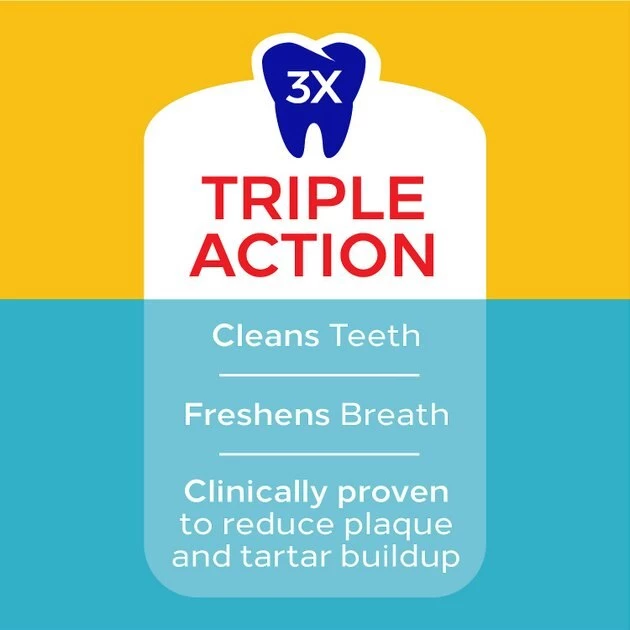 - Chewy, textured treats designed to promote daily oral health. Triple action: reduces tartar buildup, cleans teeth, and freshens breath