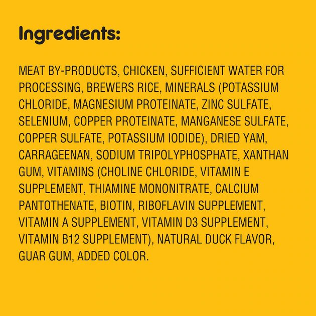 Meat By-Products, Chicken, Sufficient Water for Processing, Brewers Rice, Minerals (Potassium Chloride, Magnesium Proteinate, Zinc Sulfate, Selenium, Copper Proteinate, Manganese Sulfate, Copper Sulfate, Potassium Iodide), Dried Yam, Carrageenan, Sodium Tripolyphosphate, Xanthan Gum, Vitamins (Choline Chloride, Vitamin E Supplement, Thiamine Mononitrate, Calcium Pantothenate, Biotin, Riboflavin Supplement, Vitamin A Supplement, Vitamin D3 Supplement, Vitamin B12 Supplement), Natural Duck Flavor, Guar Gum, Added Color.