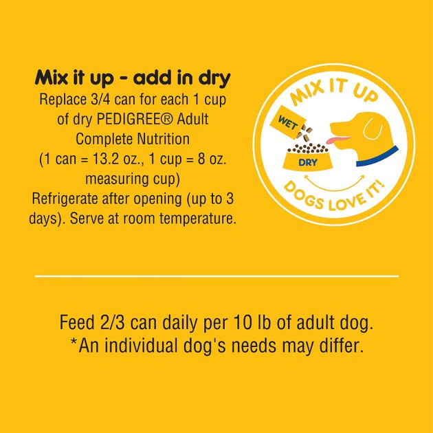 Replace 3/4 can wet for each 1 cup of dry PEDIGREE® Adult Complete Nutrition (1 can = 13.2 oz., 1 cup = 8 oz. measuring cup)