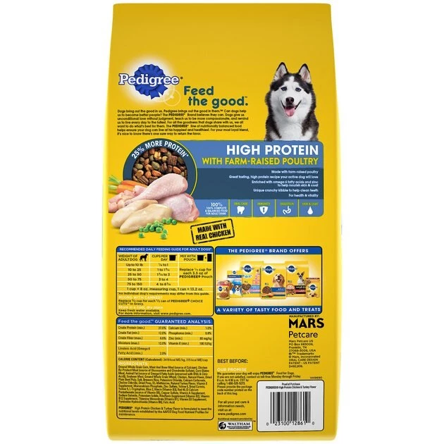 Help fuel your active dog’s lifestyle with Pedigree’s High Protein Chicken & Turkey Flavor Dog Food! This recipe is crafted with real chicken to provide your pup with high-quality protein and it offers her the 100% complete and balanced nutrition she needs. It contains omega-6 fatty acid and zinc to encourage healthy skin and a lustrous coat and has the crunchy texture dogs love. And with zero high-fructose corn syrup, artificial flavors or added sugars, you can feel confident that you’re feeding your canine companion the high-quality nutrition she deserves.