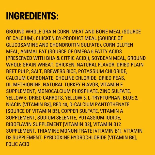 Ground Whole Grain Corn, Meat And Bone Meal (source of Calcium), Chicken By-Product Meal (source of Glucosamine and Chondroitin Sulfate), Corn Gluten Meal, Animal Fat (source of Omega 6 Fatty Acids [preserved with BHA & Citric Acid]), Soybean Meal, Ground Whole Grain Wheat, Chicken, Natural Flavor, Dried Plain Beet Pulp, Salt, Brewers Rice, Potassium Chloride, Calcium Carbonate, Choline Chloride, Dried Peas, DL-Methionine, Natural Turkey Flavor, Vitamin E Supplement, Monocalcium Phosphate, Zinc Sulfate, Yellow 6, Dried Carrots, Yellow 5, L-Tryptophan, Blue 2, Niacin [Vitamin B3], Red 40, D-Calcium Pantothenate [source of Vitamin B5], Copper Sulfate, Vitamin A Supplement, Sodium Selenite, Potassium Iodide, Riboflavin Supplement [Vitamin B2], Vitamin B12 Supplement, Thiamine Mononitrate [Vitamin B1], Vitamin D3 Supplement, Pyridoxine Hydrochloride [Vitamin B6], Folic Acid.