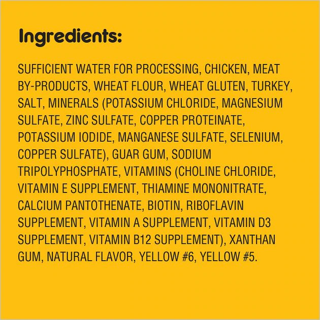 Sufficient Water For Processing, Chicken, Meat By-Products, Wheat Flour, Wheat Gluten, Turkey, Salt, Minerals (Potassium Chloride, Magnesium Sulfate, Zinc Sulfate, Copper Proteinate, Potassium Iodide, Manganese Sulfate, Selenium, Copper Sulfate), Guar Gum, Sodium Tripolyphosphate, Vitamins (Choline Chloride, Vitamin E Supplement, Thiamine Mononitrate, Calcium Pantothenate, Biotin, Riboflavin Supplement, Vitamin A Supplement, Vitamin D3 Supplement, Vitamin B12 Supplement), Xanthan Gum, Natural Flavor, Yellow #6, Yellow #5.
