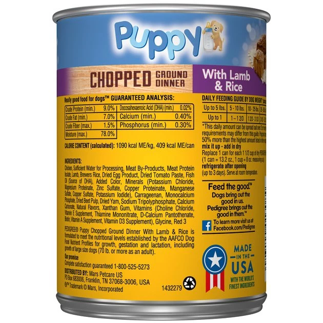 Help your puppy grow up happy and healthy with the Pedigree Puppy Chopped Ground Dinner With Lamb & Rice Canned Dog Food. Formulated specially for the needs of growing dogs, this recipe combines meaty goodness with essential nutrition. There’s optimal levels of oils and minerals for healthy skin and a shiny coat, plus highly digestible ingredients to ensure all those nutrients are easily absorbed. But all he’ll really care about is the meaty, ground goodness, which is sure to get a tail wag at every mealtime.