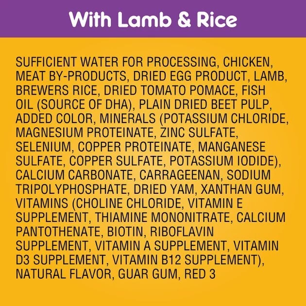 Sufficient Water For Processing, Chicken, Meat By-Products, Dried Egg Product, Lamb, Brewers Rice, Dried Tomato Pomace, Fish Oil (Source Of Dha), Plain Dried Beet Pulp, Added Color, Minerals (Potassium Chloride, Magnesium Proteinate, Zinc Sulfate, Selenium, Copper Proteinate, Manganese Sulfate, Copper Sulfate, Potassium Iodide), Calcium Carbonate, Carrageenan, Sodium Tripolyphosphate, Dried Yam, Xanthan Gum, Vitamins (Choline Chloride, Vitamin E Supplement, Thiamine Mononitrate, Calcium Pantothenate, Biotin, Riboflavin Supplement, Vitamin A Supplement, Vitamin D3 Supplement, Vitamin B12 Supplement), Natural Flavor, Guar Gum, Red 3.