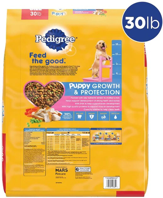 Give your little guy the big nutrition he needs to thrive with PEDIGREE Puppy Growth & Protection Chicken & Vegetable Flavor Dry Dog Food. Formulated to help your new young pup keep up with the big dogs, this food is packed with essential nutrition and a delicious chicken flavor. Including DHA for healthy brain development, plus calcium and phosphorus for healthy teeth and strong bones, it also contains leading levels of the antioxidant vitamin E to help develop strong immune systems. Plus, this balanced dog food features a special fiber blend, which helps promote healthy digestion—and helps keep yard patrol under control.