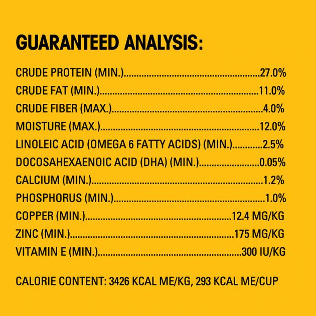 Ground Whole Grain Corn, Chicken By-Product Meal, Corn Gluten Meal, Soybean Meal, Meat and Bone Meal (source of Calcium), Animal Fat (source of Omega 6 Fatty Acids [preserved with BHA and Citric Acid]), Ground Whole Grain Wheat, Brewers Rice, Natural Flavor, Salt, Monocalcium Phosphate, Fish Oil ([source of DHA] preserved with mixed Tocopherols), Brewers Dried Yeast, Calcium Carbonate, Potassium Chloride, Choline Chloride, Dried Peas, Vitamin E Supplement, Zinc Sulfate, BHA and Citric Acid (a preservative), Niacin, Yellow 5, Yellow 6, Dried Carrots, Blue 2, Red 40, D-Calcium Pantothenate, Copper Sulfate, Riboflavin Supplement (Vitamin B2), Sodium Selenite, Pyridoxine Hydrochloride (Vitamin B6), Potassium Iodide, Vitamin A Supplement, Thiamine Mononitrate (Vitamin B1), Folic Acid, Biotin, Vitamin D3 Supplement, Vitamin B12 Supplement.